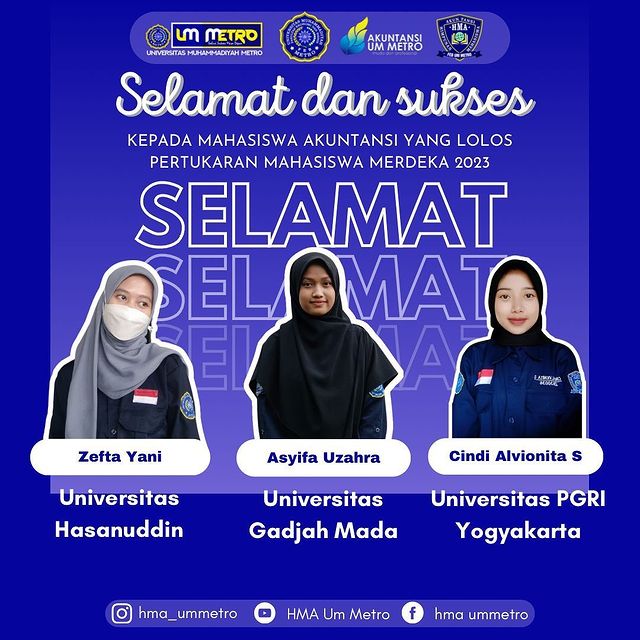 Mahasiswa program studi S1 Akuntansi berhasil lolos dalam program Pertukaran Mahasiswa Merdeka (PMM) yang diadakan oleh Kemendikbud. Kelolosan tersebut diumumkan melalui web PPM pada hari Kamis (01/06/2023). Pada program tahun ini, sebanyak 3 mahasiswa akuntansi berhasil lolos dalam program ini.