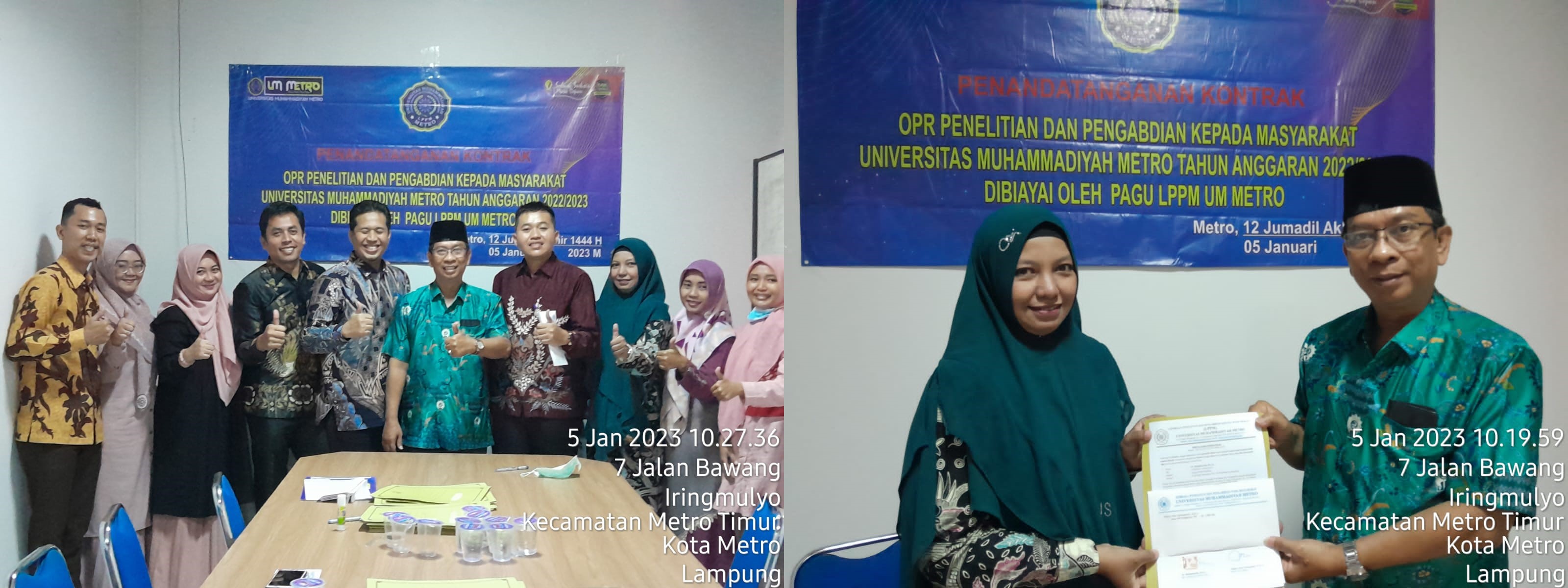 Kegiatan penandatanganan kontrak penelitian dan pengabdian kepada masyarakat disambut gembira oleh semua dosen UM Metro yang mendapat pendanaan. Dalam kesempatan ini, program studi S1 Akuntansi mengirimkan satu dosen yang menerima pendanaan dalam OPR Pengabdian kepada Masyarakat yang didapat oleh Ibu Elmira Febri Darmayanti dengan judul “Pendampingan Pengolahan Pleurotus Ostreatus, Digitalisasi Marketing, Pembukuan Keuangan di KWT Srikandi Desa Banjarrejo”.