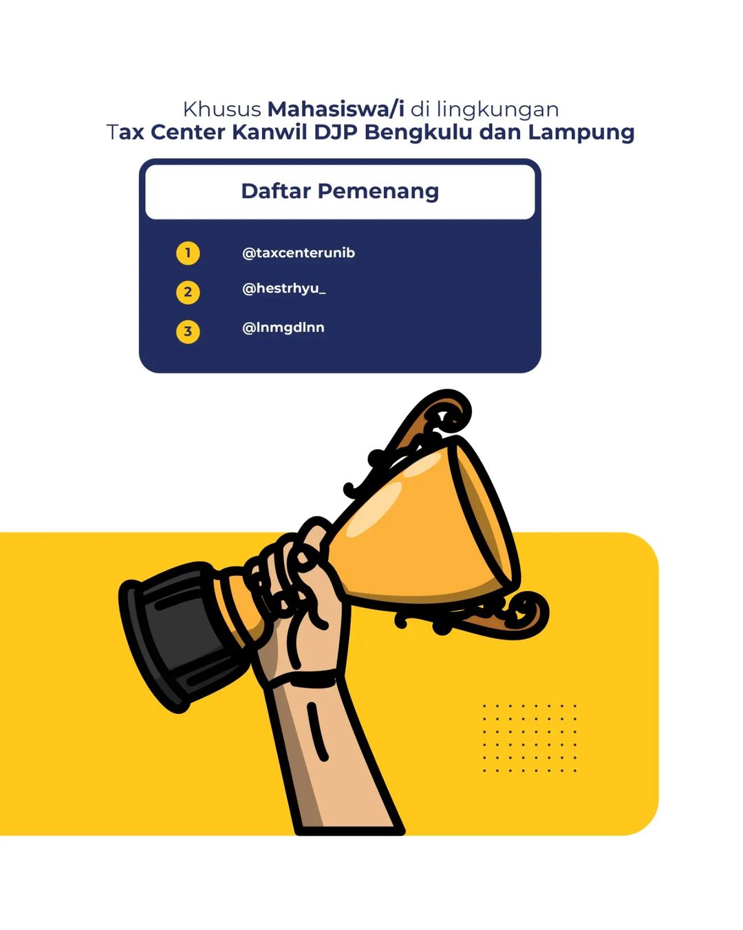 Mahasiswa semester 6 Prodi Akuntansi, Lena Magdalenna berhasil meraih juara 3 dalam lomba reels Instagram pada Spectaxcular Tahun 2023. Lomba ini dilaksanakan secara daring melalui Instagram. Dalam pengumuman yang dilakukan pada 27 Maret 2023, Lena menduduki posisi 3 untuk kategori mahasiswa di lingkungan Tax Center Kanwil DJP Bengkulu dan Lampung.