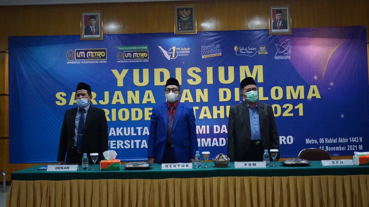 Fakultas Ekonomi dan Bisnis Universitas Muhammadiyah Metro mengadakan Yudisium Periode III tahun 2021 dengan di ikuti oleh 4 (empat) prodi dengan jumlah masing-masing peserta sebanyak 177 mahasiswa dengan yakni : Prodi S1 Manajemen 105 mahasiswa, Prodi S1 Akuntansi 51 mahasiswa, D3 Perbankan dan Keuangan 14 mahasiswa dan D3 Akuntansi 7 mahasiswa. Dari 177 mahasiswa yang di Yudisium itu muncul nama dengan IPK tertinggi 3,73 yaitu Yuni Tri Astuti dari Prodi Manajemen, Umbroh Nurhasanah dengan IPK 3,86 dari Prodi S1 Akuntansi, Galuh Dewi Bestari dengan IPK 3,77 dari Prodi D3 Perbankan dan Keuangan dan Sigit Al-Bahril dengan IPK 3,82 dari Prodi D3 Akuntansi.
